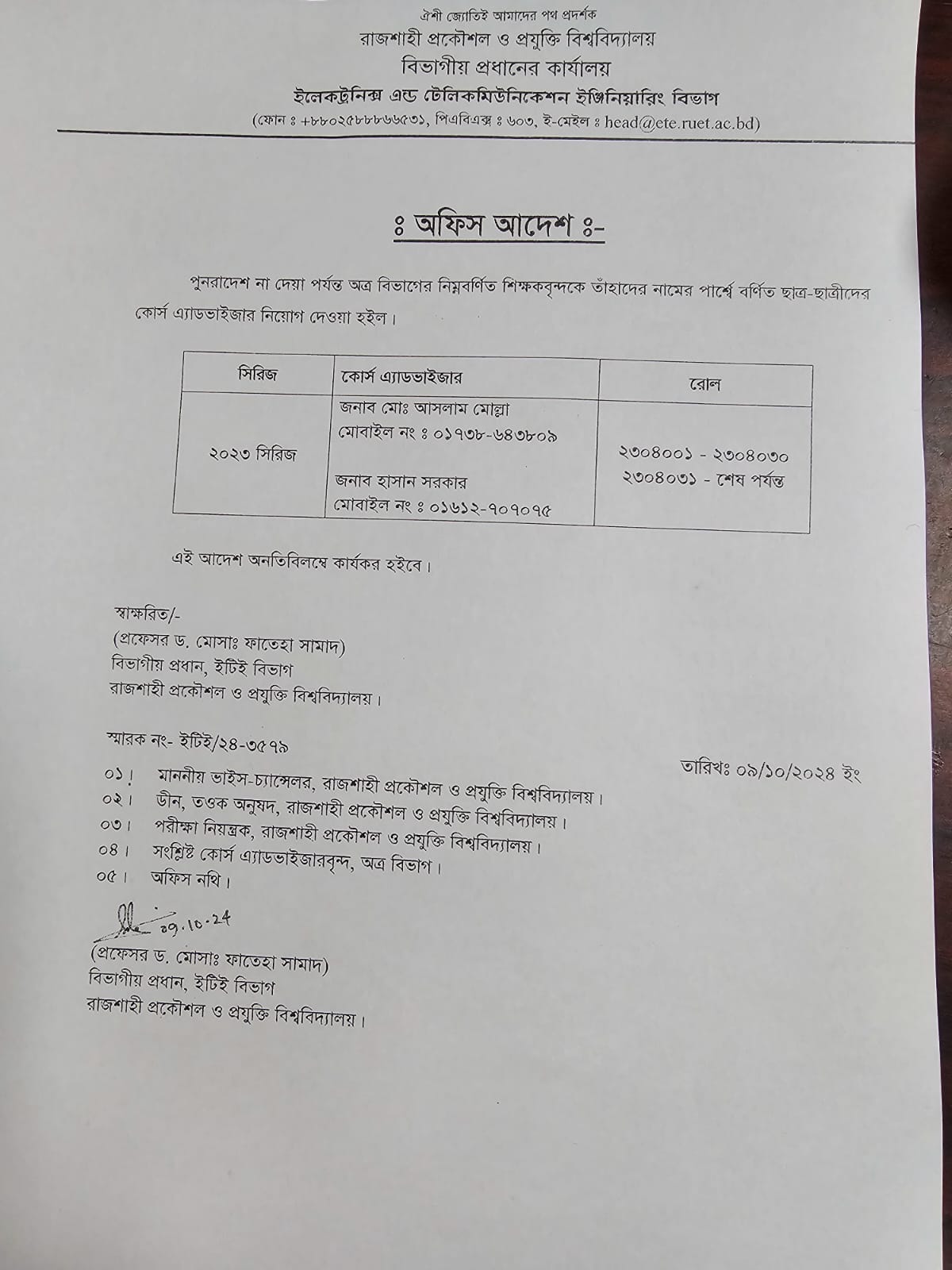 Office Order: Md. Md. Aslam Mollah , Assistant Professor, Department of Electronics & Telecommunication Engineering (ETE), & Hasan Sarker, Assistant Professor, Department of Electronics & Telecommunication Engineering (ETE), have been appointed as the Course Advisor for the ETE 23 Series. All related academic and advisory matters should be directed to him.
